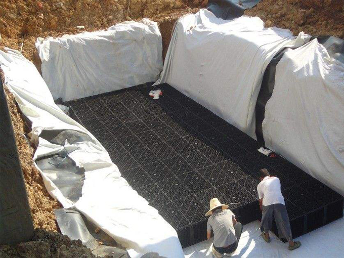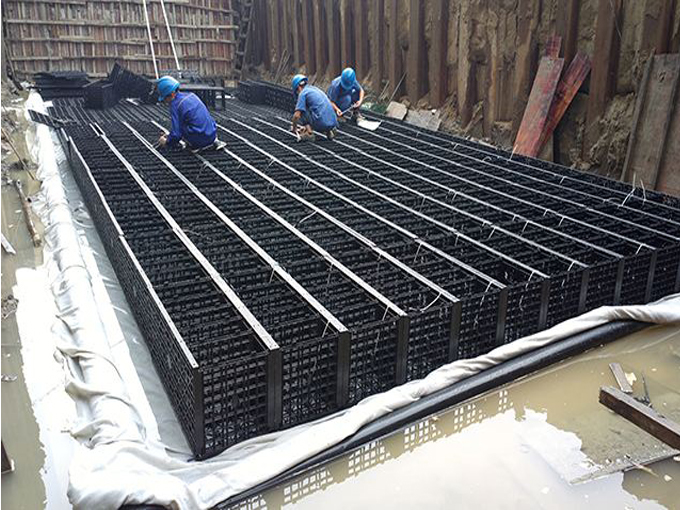 雨水PP蓄水模塊采用可再生的聚丙烯材料制作而成,由不同規(guī)格尺寸的網(wǎng)格狀平板拼裝成模塊化的箱體,然后將每一個(gè)箱體碼放成為連續(xù)的雨水“矩陣”池。因?yàn)槠渚W(wǎng)格化透空的結(jié)構(gòu),材料的結(jié)構(gòu)占用空間不到5%,即模塊的蓄水空間達(dá)到95%以上,雨水可以在其中自由交換流動(dòng)。